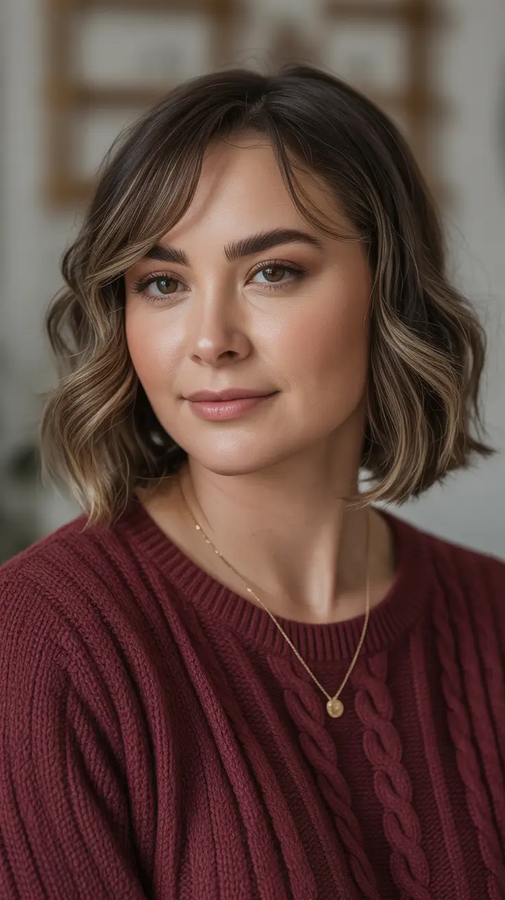 The secret to winter glow is a mid neck beachy bent lob with soft bangs and honey kissed ribbons framing the face. The waves widen below the cheekbones and not at them, which is key for winter haircuts for round faces with bangs and winter haircuts medium round faces. It’s polished, yet playful, like a favorite knit on a weekend brunch.