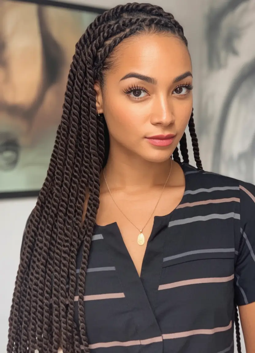 Shapely and protective, long Senegalese twists with a deep side part are my favorite winter hairstyles for black women. These are very low maintenance, scarf friendly, and sit well underneath all winter hairstyles with braids, even though they are two strand twists. A black striped top and delicate pendant paired with the hair gives the overall vibe a sharp, modern, and confidently Easy touch.